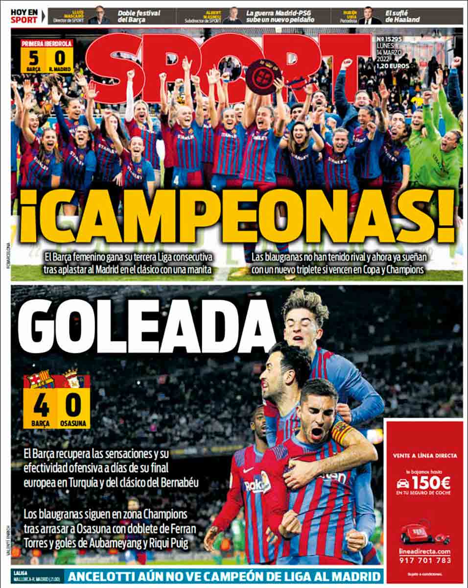 Mundo Deportivo divide su portada en dos partes desiguales, con muy mejorable criterio estético, para dar la importancia que no negamos merezca el éxito de sus jugadoras, reservando un frontispicio menor para la victoria liguera de los varones ante el Osasuna, por 4-0, en un encuentro con poca historia. Lo que sí tuvo historia ayer en el ámbito blaugrana fueron las declaraciones realizadas por Jan Laporta, quien reculó de manera harto jocosa respecto a anteriores manifestaciones sobre Haaland, en las que se mostraba optimista en cuanto a la opción de vestir de azulgrana al crack nórdico. Parece que, después de todo, no se va a fichar al noruego, y así lo reconoció el bueno de Jan en declaraciones en el descanso del partido de las chicas.