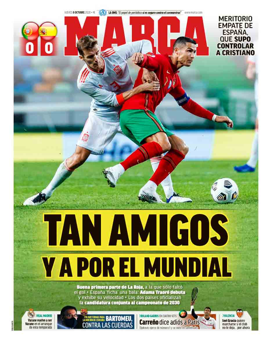Marca asume el bodrio de ayer en Lisboa con un espíritu que ni James Rhodes interpretando el Himno de la Alegría. Viva la armonía, vivan los claveles y viva el sentimiento ibérico, de acuerdo, todo lo que queráis, amigos de Marca. Está bien que España y Portugal aspiren a celebrar un Mundial en comandita, avanzando en el concepto de la balsa de piedra de Saramago. Está bien que podamos comprobar en directo que Cristiano sigue inmenso y reencontrarnos con Pepe, pero no en estas circunstancias, caralho. ¿Por qué (...) -añadan aquí la expresión coloquial de su preferencia- tuvieron España y Portugal que jugar ayer en Lisboa, dando pábulo gratuito a un riesgo de contagio a todas luces innecesario? ¿Pur qué? ¿Pur qué? (Léase con el mejor acento luso de que sea capaz el lector).