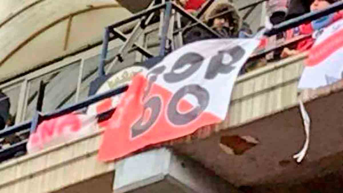 O enseñando una pancarta en favor de uno de los miembros de la Manada, el Gordo.