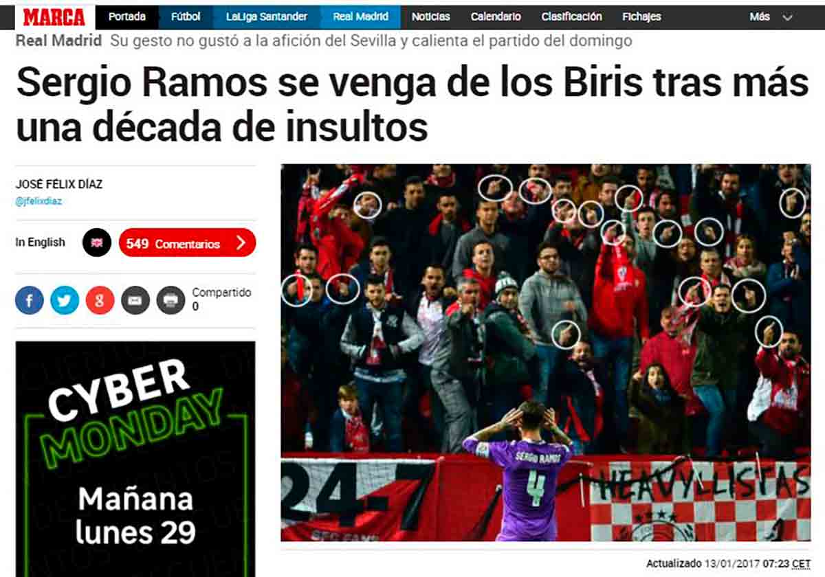 Esa animadversión de tantos jugadores y directivos se traslada a las gradas, con el peligro que ello conlleva cuando tienes una banda de radicales como los Biris Norte, gente capaz de pasarse un partido entero insultando a Ramos o enseñando una pancarta en favor de uno de los miembros de la Manada, el Gordo