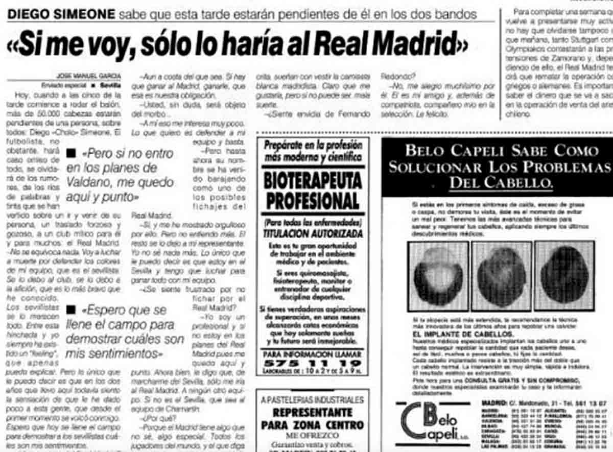 Esa captura de la entrevista en la que el Cholo afirmaba que "si me voy (del Sevilla) solo lo haría al Madrid", con el paso del tiempo ha resultado premonitoria. No porque haya venido al Madrid, sino por el anuncio de "Belo Capeli" que lo acompañaba: "Belo Capeli sabe como solucionar los problemas de cabello ". No se si en Belo Capeli o en Capeli Otomani, pero ha solucionado sus problemas del cabello.