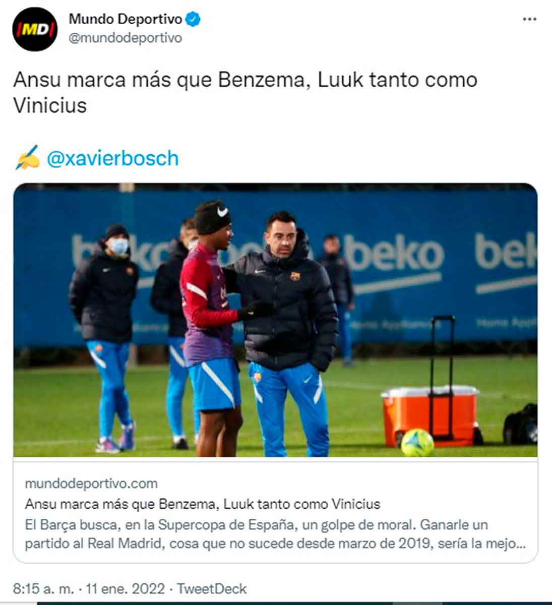 ¿Cómo lo veis, amigos? Se supone que habrán cogido estadísticas de los tres minutos y medio que habrán jugado en lo que va de campaña tanto Ansu como Luuk De Jong y habrán obtenido que el ratio goleador de ambos en esos tres minutos y medio es superior al de Benzema y Vinícius, respectivamente. Como señalaba un agudo tuitero, sería como darle el Trofeo Zamora a Lunin por haber jugado diez minutos en todo el campeonato sin haber encajado un solo gol. El ratio es inmejorable, pero la muestra estadística para obtenerlo es ridícula. Así es como Mundo Deportivo se ríe del lector culé, o mejor dicho: así es como se autoengaña el culé que compra la mercancía averiada de Mundo Deportivo.