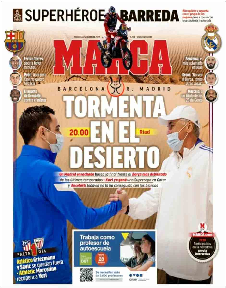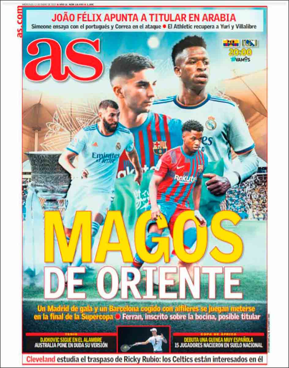 Buenos días. Noche de tambores y cornetas la que se avecina. El Real Madrid juega contra el Barça y eso supone siempre un acontecimiento de primer nivel, incluso aunque sea en semifinales de un torneo menor, incluso aunque se juegue en un lugar que ética y estéticamente, de forma inevitable, nos rechine. Es cierto que hablamos de un Barça minimizado, balbuceante, huérfano y europaliguizado, pero —como la prensa deportiva que padecemos no se hace cargo de esa situación— es como si siguiéramos jugando contra un Barça grande. Ya sabéis que Pedri es Iniesta, Gavi es Lothar Matthaus, Nico es Mauro Silva y Abde (¿se llama así?) es Ginola. Por ello mismo, el Clásico sigue siendo un Clásico como Dios (o Alá en este caso) manda, sin descafeinar ni nada. Sería descafeinado en todo caso si el Barça solo contara con un puñado de juveniles más o menos prometedores más varios veteranos en horas bajas más poco más, pero no es así, claro que no. Si fuera así, lo pondrían los periódicos por alguna parte, pero no lo ponen.