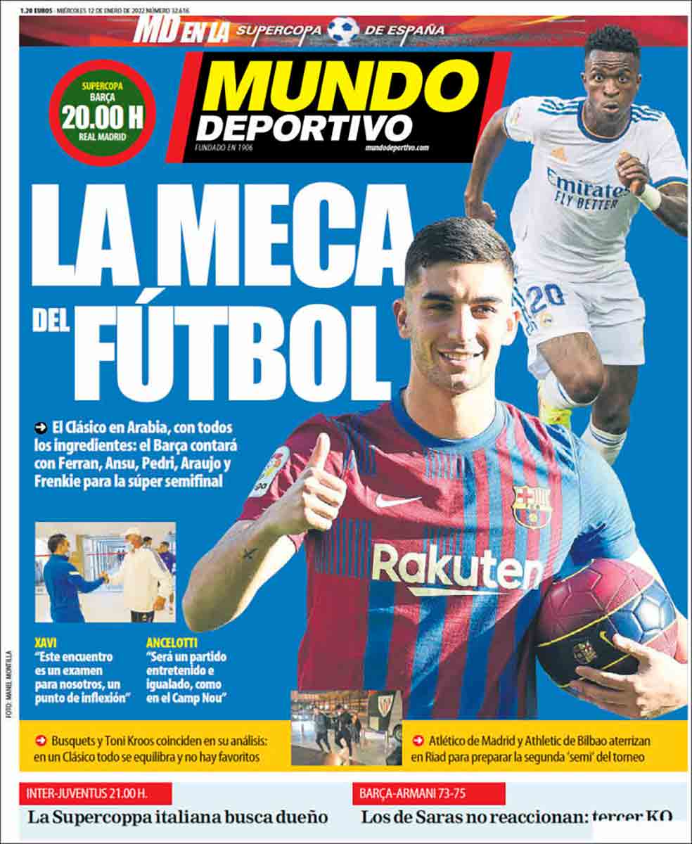 Aquí podemos observar, por ejemplo, cómo Mundo Deportivo otorga a Ferran Torres una estatura desproporcionada en relación a la de Vinícius, como dando a entender, suponemos, que el valenciano es futbolista de mucho mayor peso que el brasileño. El tamaño importa, amigos, digan lo que digan las tendencias relativizadoras. Esto de poner a Ferran magnitud cíclope junto a un Vinícius liliputiense (es casi un loro posado en el hombro de Ferran) es un poco como esos tuiteros que lo ponen todo en mayúsculas para tener más razón. Lo consiguen, claro. Y Mundo Deportivo logra también, a base de poner a Vini jibarizado como la mascota del nuevo fichaje blaugrana, que el madridista pase a no tener ningún peligro mientras crece y crece el tamaño de Ferran. Es así de sencillo, y no alcanzamos a entender por qué no hacen lo propio con todos los jugadores. Así, por parejas. Gavi en gigante; Kroos en pequeñito. Pedri en descomunal; Modric mínimo. Mingueza homérico; Benzema chiquitín. Y así sucesivamente. Es una forma infalible de lograr que el choque sea un paseo militar para los blaugranas, y de verdad que se nos escapa la razón por la que no vienen haciendo portadas así, desde hace muchos días, en previsión del partido y para modificar el karma relativo al mismo.