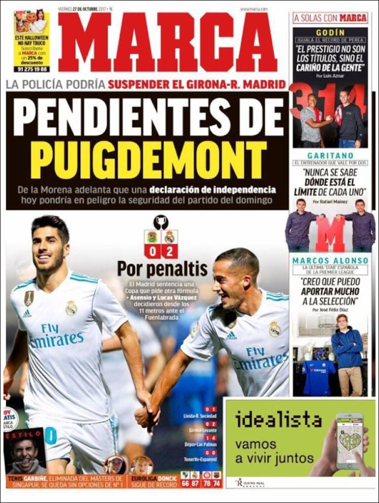 Podríamos referirnos a las concomitancias estrictamente deportivas de una hipotética DUI, como hace Marca, pero ni siquiera eso nos satisface. Porque digámoslo bien alto y bien claro, incluso desde la posición de un medio cuyo principal (pero no único) interés es el Real Madrid: ¿importa mucho que se pueda aplazar un partido del Real Madrid, si este hecho se pone en consonancia de lo que a nivel global representaría una situación política de esta gravedad? Aun siendo grave, la posible no celebración del partido ante el Girona es anecdótica puesta en el marco general de la situación.