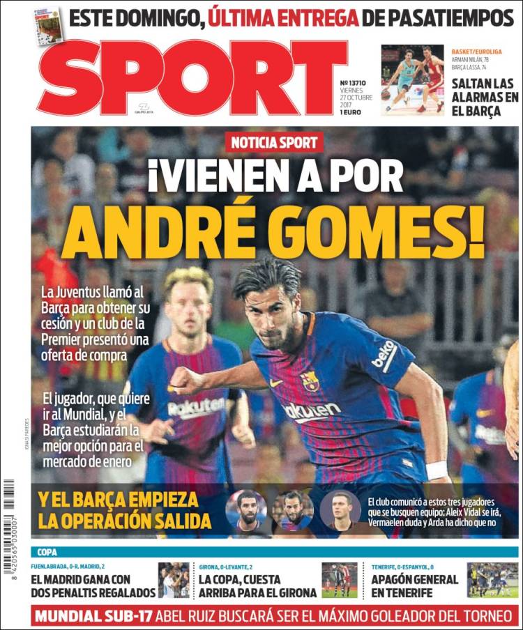 Sí, amigos. Las idas y venidas del día, las elecciones convocadas pero no del todo convocadas y finalmente no convocadas (en armonía con las independencias (des)proclamadas y los artículos 155 latentes pero no activos aunque), los mentidos y desmentidos y desdesmentidos en comparecencias programadas y diferidas y canceladas, se resumieron en una portada de Sport que muy bien podría competir con la de Bellerín del 4 de junio (San Bellerín de Cardiff) en su desconexión con la realidad. Sport rizó el rizo de conectarse y desconectarse de las cosas (y mira que el listón estaba alto) para depararnos a todos este WTF mayestático y arrabalero (pero no en el sentido porteño, sino en el de Fernando Arrabal en su mejor etapa pánico). "¡Vienen a por André Gomes!", grita, clama, berrea Sport desde su primera plana, y le deja a uno en la disyuntiva de decantarse -en respuesta al hallazgo- por la pregunta 1 o por la 2.
