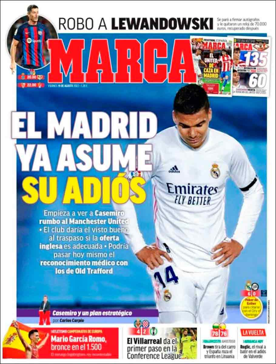 A Lewandowski le robaron el reloj y a nosotros nos han robado el alma. El reloj de Lewandowski apareció después, pero no podemos garantizar que el alma vaya a seguir la misma ruta de encuentro con su dueño. Lo del polaco aparece ahí arriba, seguramente por la falta de reflejos del portadista de Marca, que no calcula que un hurto, al fin y al cabo subsanado después, no puede restar un solo milímetro cuadrado de portada al hombre del día, se vaya finalmente (como parece) o no. Porque, se vaya o no, lo que han dejado claro en las últimas horas las redes sociales y los medios y las conversaciones de chiringuito es que Casemiro no es cualquier cosa. Es el armazón de nuestro orgullo, el esqueleto de nuestra alegría de vivir. Por eso merecería la portada entera, incluso aunque aún no se haya ido, incluso aunque esto solo sea un preadiós torpe, transido de confusión indecisa. Nadie merece quedarse sin Casemiro aunque la lógica dicte que deba hacerlo, y desde aquí solo nos resta emitir un quejido, un nudo en la garganta, emulando a Springsteen cuando quería convencer a Bobby Jean de que volviese diciéndole que en realidad no pretendía convencerla, not to change your mind, but just to say I miss you, good luck, goodbye. Hoy la expresión alicaída del Jonathan Woodgate que traemos los viernes al slide del portanálisis tiene un matiz inalcanzablemente melancólico, sosteniendo su 2o Minutos como quien sostiene eso, la esperanza, y casi se compadece por ella.