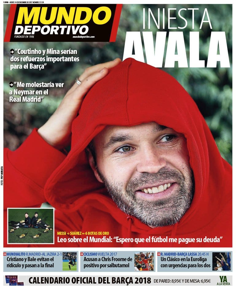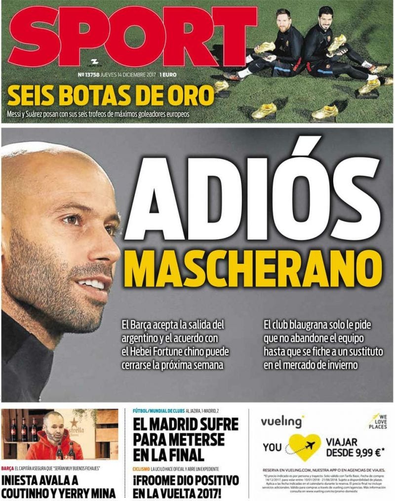 En Matrix no se han enterado de que se está jugando un mundialito tal y como demuestran los breves de sus portadas. Tampoco se han enterado de que Cristiano ya es el máximo goleador histórico del torneo. Tampoco se enteraron en su día de la marcha de Neymar. Tampoco parece especialmente enterado o prolijo en titulares Andrés Iniesta vestido de Teletubbie en Mundo Deportivo. El que sí se ha enterado de dónde está la panoja es Mascherano que prefiere una morterada en la prestigiosa Liga china antes que jugar por y para el mejor jugador de todos los tiempos y todas las eras. Será por eso que le llaman Jefecito.