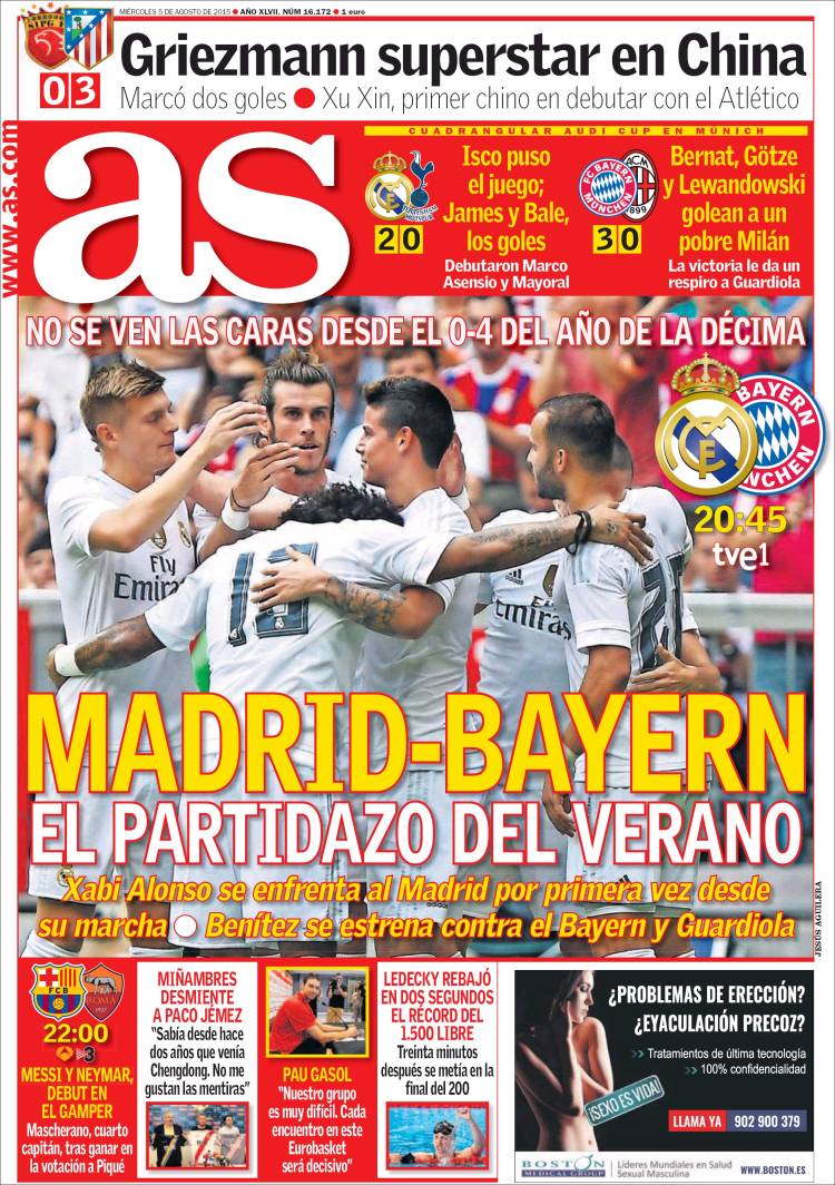 Y sí: como anuncia As, la consecuencia de la victoria de ayer ante el Tottenham es que hoy disputaremos la final del torneo veraniego en que se enmarca, y que al haberse clasificado para dicha final también el Bayern de Múnich tendremos ocasión de reencontrarnos con varios viejos conocidos. Con Pep Guardiola coincidimos hace un par de años en el Campeonato Europeo de Atletismo que se celebró precisamente en Múnich, donde batimos el récord mundial y planetario de pasado y futuro con aquellas estratosféricas cuatro décimas (0,4) para un recorrido de fondo que acabó en Lisboa. Pep -lo recordamos bien- fue descalificado en la salida por empeñarse en ir dando pataditas a un balón durante la prueba, en pretensión flagrantemente antirreglamentaria. Será grato volver a verle. El quijotismo es bello aun en quien reniega de la Meseta.
