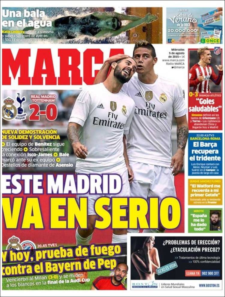 Luego está lo de los tatuajes, cuya desaforada fiebre no podemos menos que condenar también (ver de nuevo la portada del Marca y reparar en los brazos invadidos de motivos raros de Isco y el propio James), aunque nos preguntamos súbitamente azorados si condenar las mechas y el abuso (cuidado: solo el abuso) del tatuaje no será piperismo. La duda nos deja postrados en un estado de desvalimiento paralizante, o quizá sea solo que hoy no corre la brisa y la indolencia nos domina.