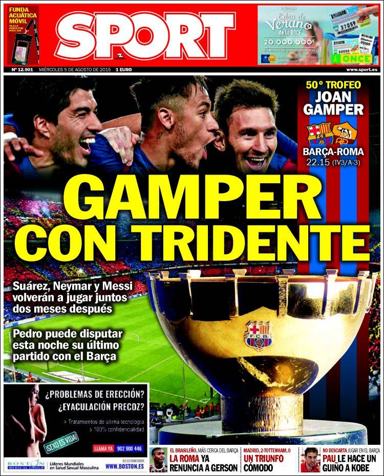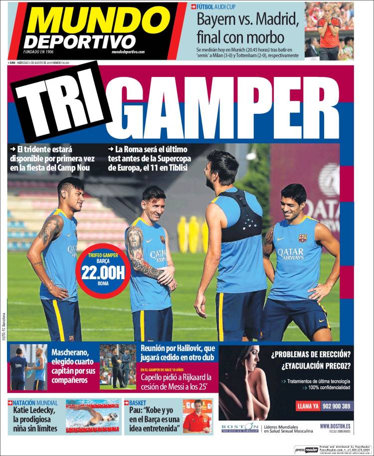 El Barça, por su parte, prosigue en la onda desinhibidamente eufórica que se trae desde el mes de mayo, y quiénes somos nosotros para intentar poner freno a su júbilo (y sobre todo: ¿cómo hacerlo?, pues ya querríamos). Hoy juegan el Gámper y todo se relaciona, como si de una clave esotérica se tratara, con el número tres: tridente, triplete, triGámper (?). Esto lo coge Dan Brown y te hace un Código Da Vinci de manual, pero eso no es lo peor. Lo peor (y nos consuela saber que el banco culé nos supera en este apartado) es lo de los tatuajes. Véase si no la foto de portada de Mundo Deportivo, donde el Jesuscristo que suspira en el bíceps de Messi parece destinado a ser confortado en el casto abrazo de la María Magdalena que nos observa desde el bíceps de Neymar. La compenetración de ambas estrellas es ya una experiencia religiosa.