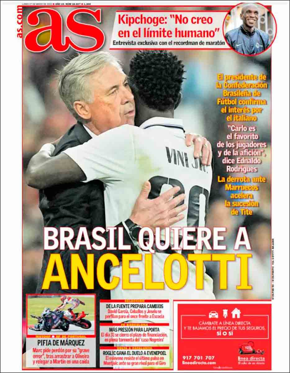 El diario As dedica la mayor parte del espacio de su carátula al interés de la selección de Brasil por contratar como técnico a Carlo Ancelotti. Hace tiempo que se conoce y no nos extraña, la verdad, nuestro técnico no solo es uno de los mejores de la actualidad, sino que atesora un palmarés que lo sitúa en un puesto destacado dentro de los entrenadores más importantes de la historia.