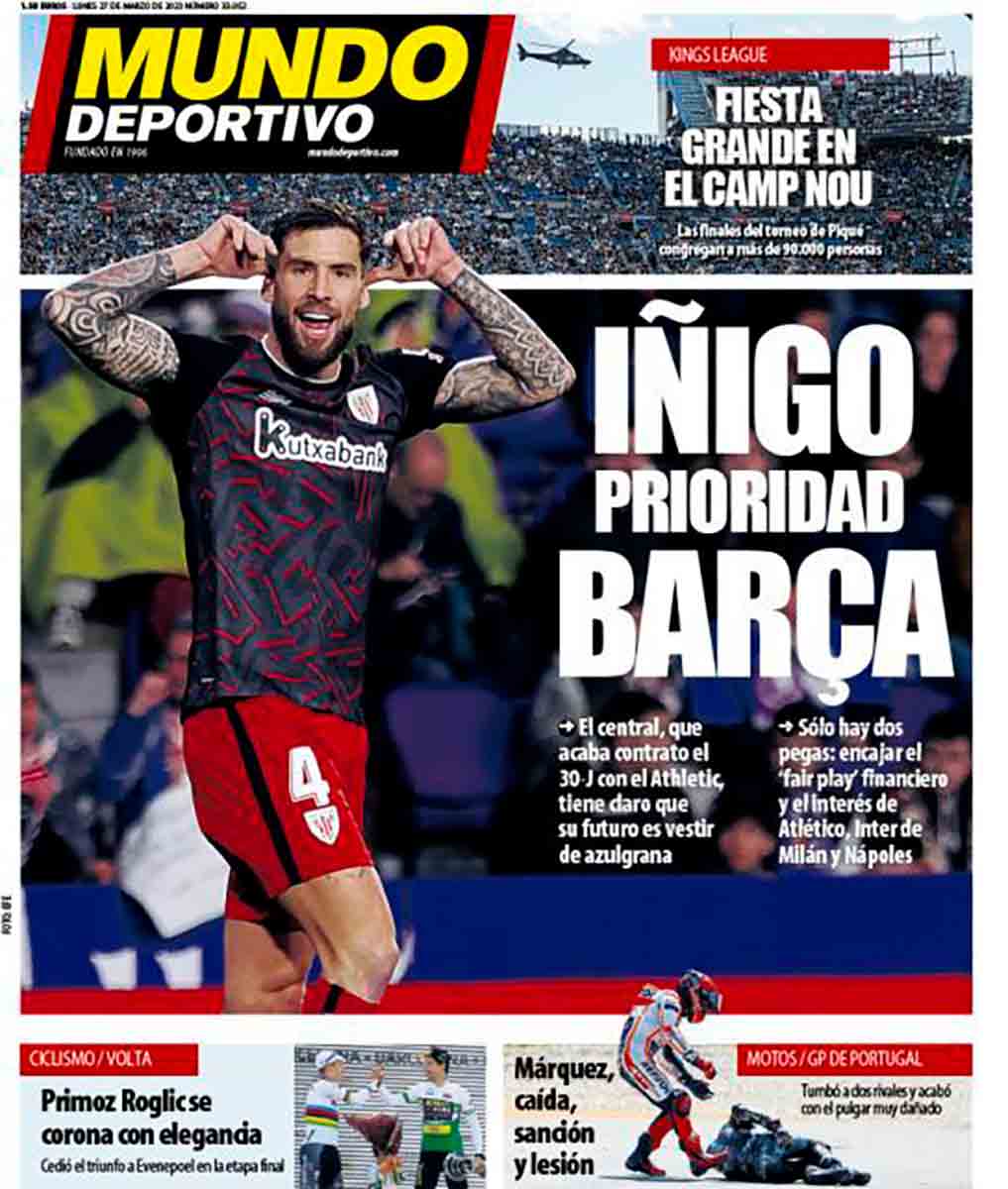 Para Mundo Deportivo, la prioridad del Barça es Íñigo. La verdad es que, estando como están, se nos ocurren otras, pero bueno. Indican que solo hay dos pegas: encajar el “fair play” financiero y el interés por el jugador de otros equipos como Atlético, Inter y Nápoles. Nada, cosillas como cumplir la ley (je, je) y que equipos que no están sumidos en la quiebra ni en una trama de corrupción por pagar al colectivo arbitral lo quieran contratar.