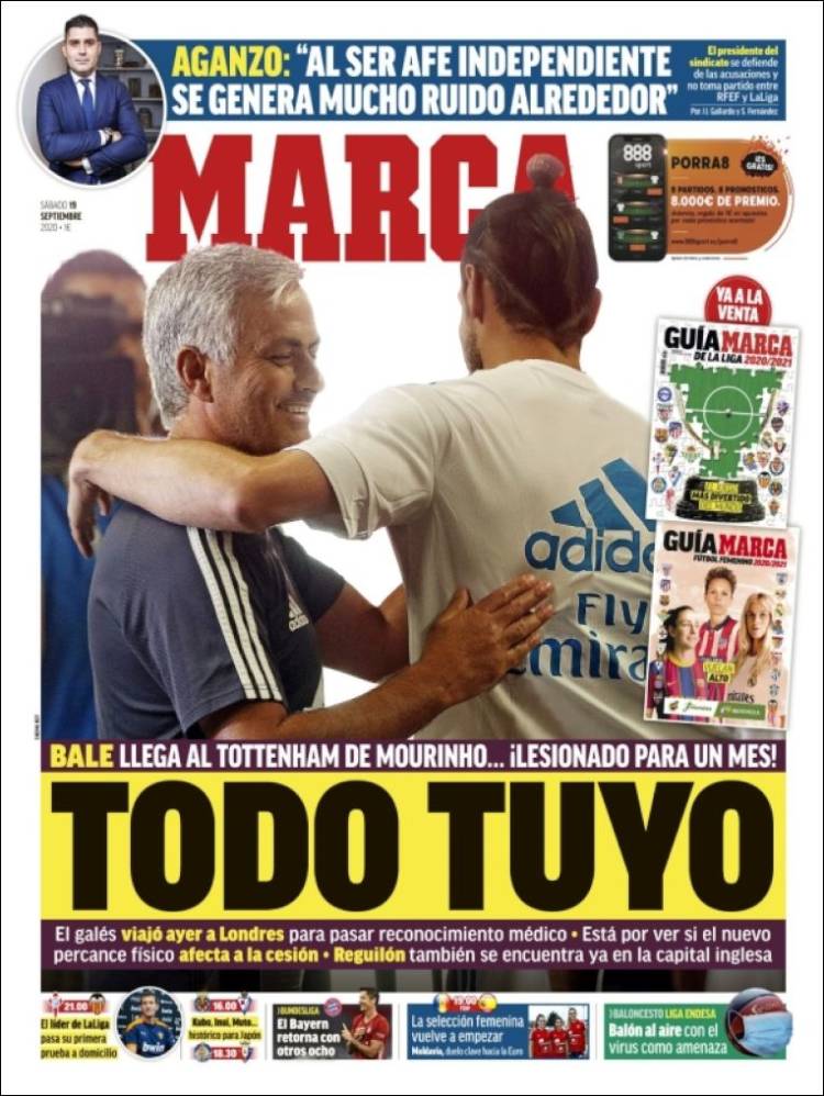 Si la portada de Marca hace entrega de Bale como si de un paquete sospechoso se tratase, As parece limitarse a constatar la buena acogida (de héroe) que recibe -que recibirá- el galés en su nuevo antiguo club, dejando atrás la villanía que se le endosaba en su (casi ya no) actual club. Todo ello sin mencionar ambos medios, faltaría más, su responsabilidad en atribuir dicha villanía y dicha sospecha al jugador día sí, día también. Todo ello sin hacerse cargo de los años (¡años!) de inmundicias perpetradas por nuestra prensa contra la figura de Bale. Todo ello, en definitiva, con la misma poca vergüenza de casi siempre.