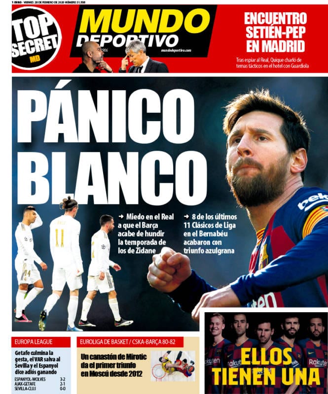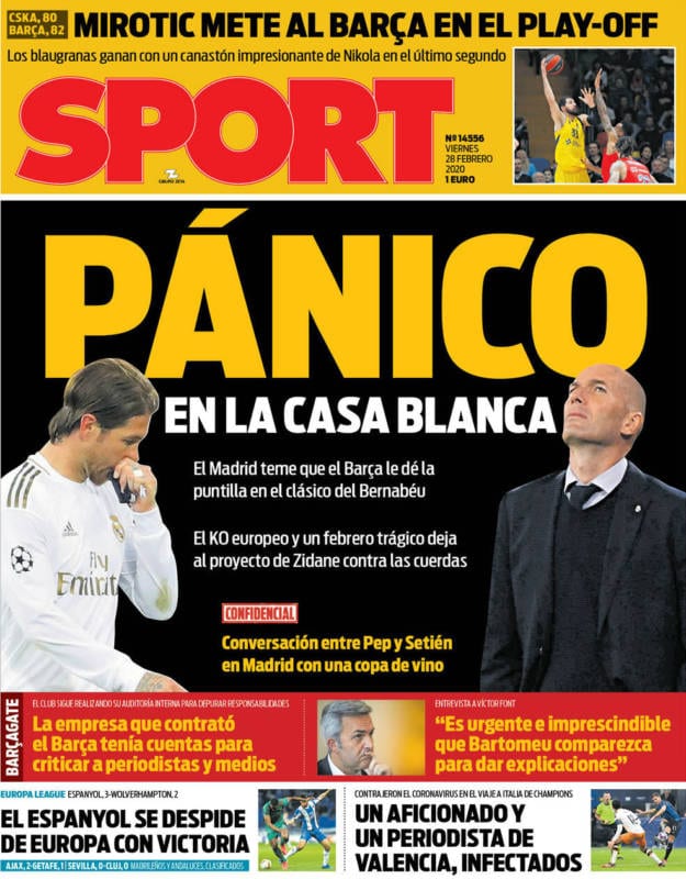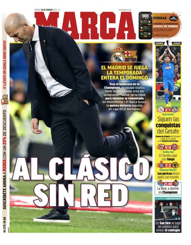 No sabemos cómo andan los ánimos en el vestuario blanco. Pero sí sabemos cómo deberían andar si por ahí hay orgullo (y nos consta que lo hay) y hoy se enfrentan a estas primeras planas tan absolutamente sobradas y faltas de vergüenza. La Liga es una competición diferente a la Champions, una en la que solo unos partidos raros y desafortunados (con lesión de Hazard por medio) han podido apear al Real Madrid de lo que hasta hace muy poco era una posición de dominio. Habla Sportivo de que hay “pánico” a que una derrota ante el Barça “dé la puntilla” al Madrid, “pánico” a que esa hipotética derrota “acabe de hundir” la temporada de Zidane. Para acabar de hundir algo hace falta que esté hundido, se nos ocurre. Para dar la puntilla a este toro primero hay que hacerle hincar rodilla en suelo. Ni siquiera perdiendo habrá dicho el Madrid adiós a una Liga que estará difícil pero no imposible. Y el pánico es de ellos. Pánico, precisamente, a ese espíritu irreductible del cual se carece por pagos blaugranas, allá donde todo tiene que ir cuesta abajo para que no se quiebren los ánimos, allí donde no son nadie sin sus undianos, closes y de burgoses de turno. Nadie.