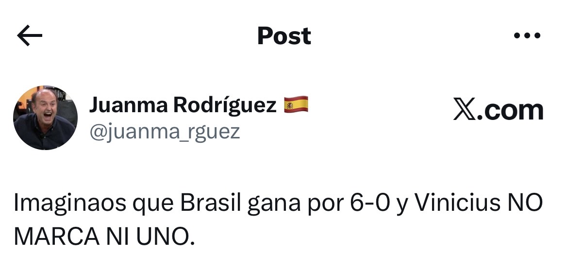 Preocupantes testimonios, amén de completamente inventados por nuestra parte, exactamente igual que la prensa se inventa cosas para presionar a Vinícius con cualquier excusa. De hecho, todo esto que acabamos de narrar, pura distopía futbolística, está inspirado por un (a su vez) inspirado post de Juanma Rodríguez en X.