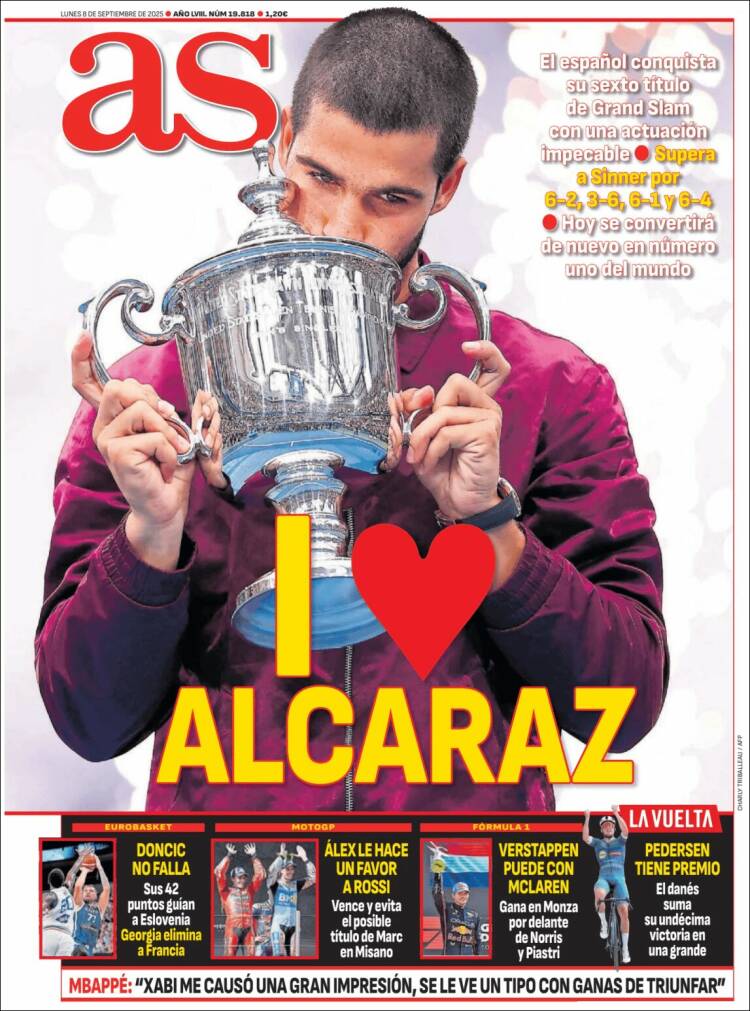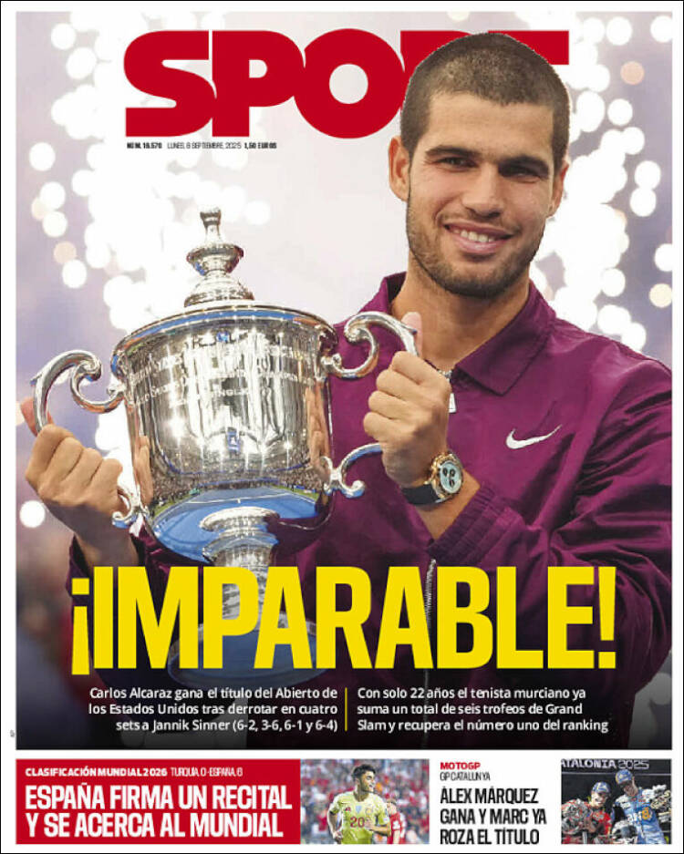 Buenos días, amigos. Las portadas de la prensa deportiva patria del día vienen casi monopolizadas por la apabullante victoria de un descomunal Carlos Alcaraz en la final del US Open. El murciano es número 1 del mundo merced a esta nueva heroicidad, obrada además ante Sinner, su némesis.