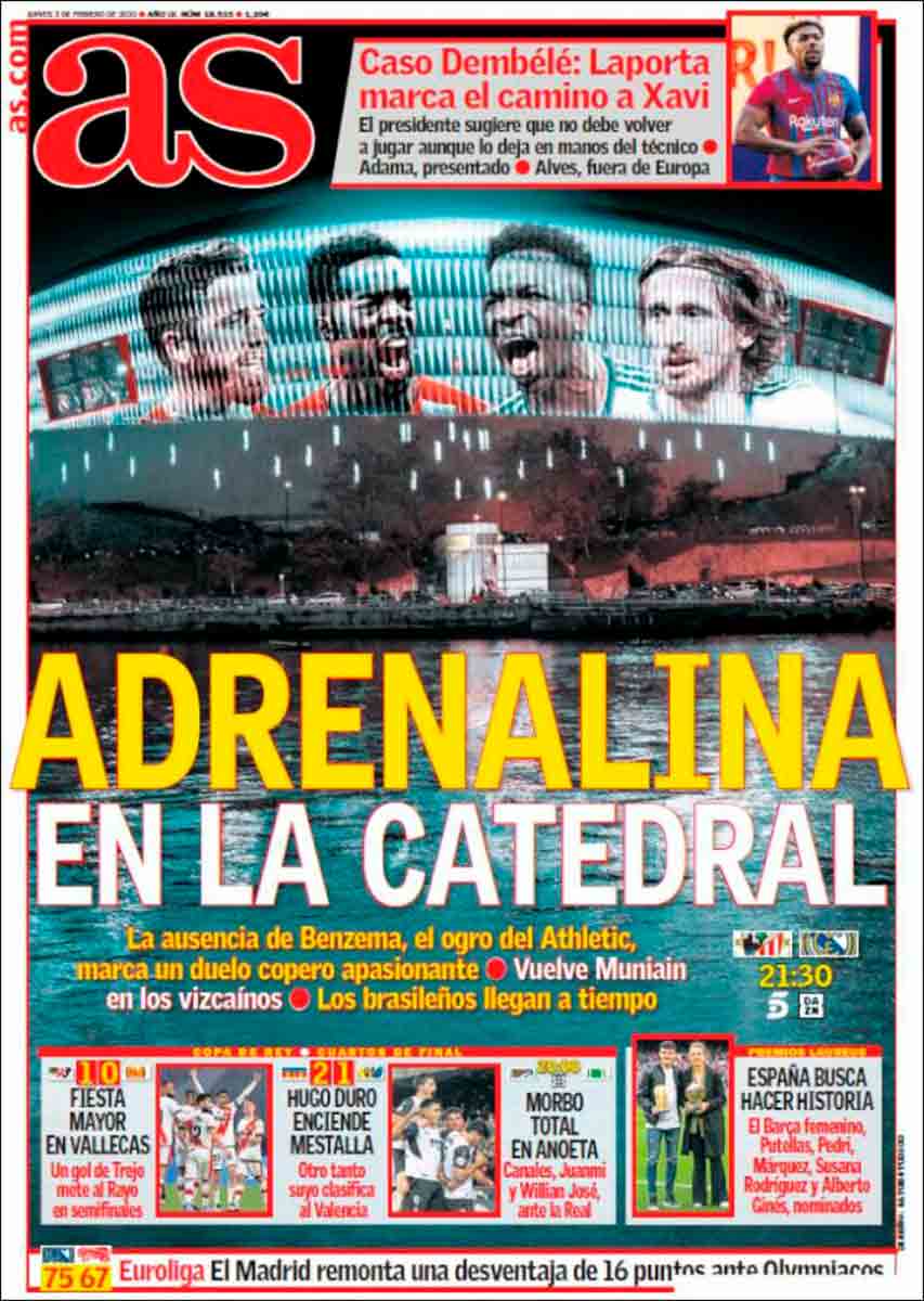 Marca titula “Cuarto asalto” al haberse enfrentado ya ambos equipos tres veces en lo que va de temporada. El Madrid tiene la baja de Benzema, pesadilla del Athletic y catalogado por el propio Marcelino como el mejor futbolista de la Liga en lo que va de temporada con mucha diferencia (sic). Por contrapartida, Ancelotti recupera a Carvajal y Asensio. Los brasileños del Madrid acaban de darse una paliza de fútbol y vuelos y, aunque estarán disponibles, sus capacidades físicas probablemente estén mermadas.