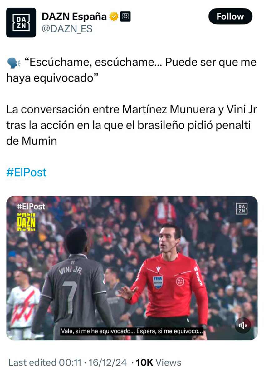 Ayer precisamente se publicaron unas imágenes de DAZN en las que se ve a Martínez Negreira, digo Munuera, admitiendo ante Vini, durante el partido, que tal vez se había equivocado. La pregunta saltó como un resorte en el consejo de redacción de La Galerna.