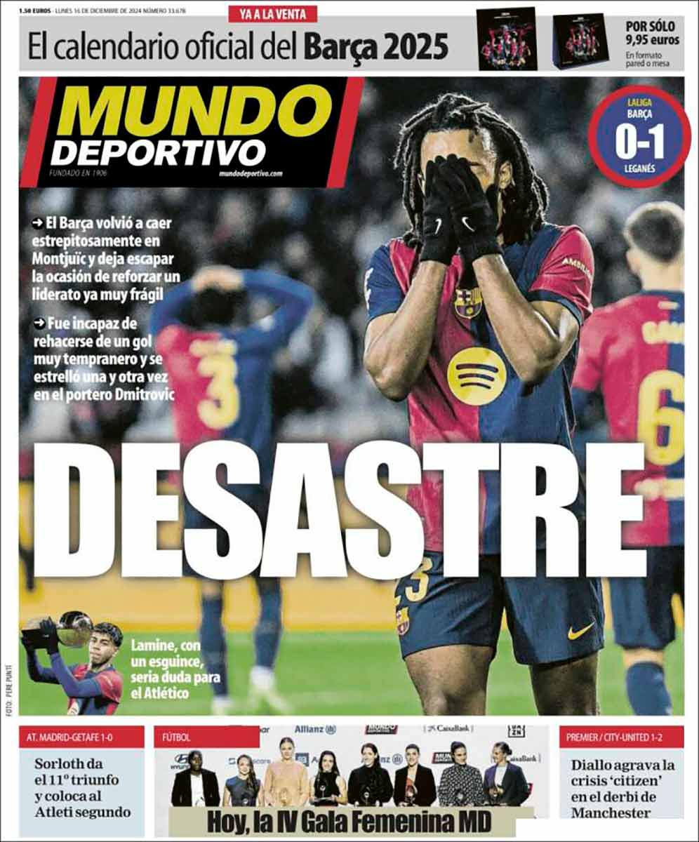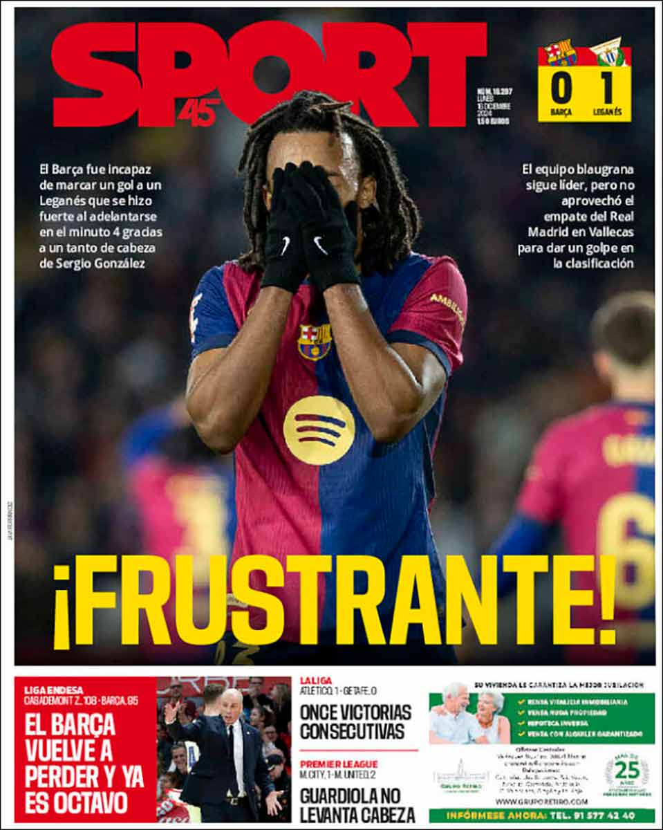 Sí, amigos, el club cliente de Negreira, que solo ha logrado 5 puntos de los últimos 18, se pegó un costalazo notable palmando contra el Leganés en su propio feudo (0-1) y mostrándose incapaz de remontar el tempranero gol pepinero en casi noventa minutos. Esta noticia nos habría alegrado sobremanera en circunstancias normales, pero todavía nos dura la cólera por lo acontecido en Vallecas, de manera que no podemos ni celebrar. Las portadas de la prensa cataculé vienen enojadas con su equipo, lo cual debería producirnos regocijo. Pero no llega a hacerlo. El asco ante el continuismo del mundo negreiril ahoga la risa característica de estas situaciones. Estamos instalados en una suerte de nihilismo doliente. En la confianza de que a vosotros no os pase lo mismo, y seáis capaces de responder con el debido jolgorio, os hacemos partícipes de esas portadas.