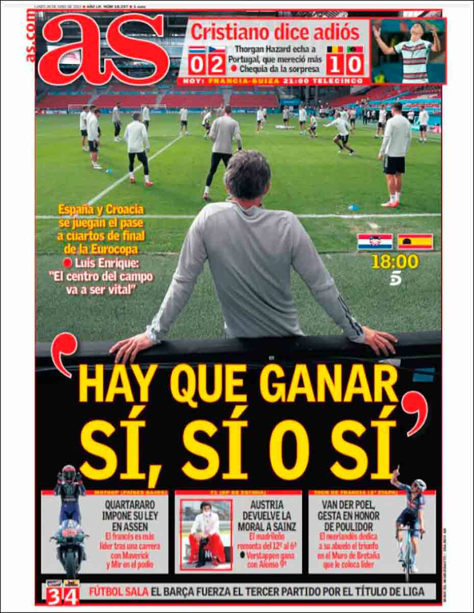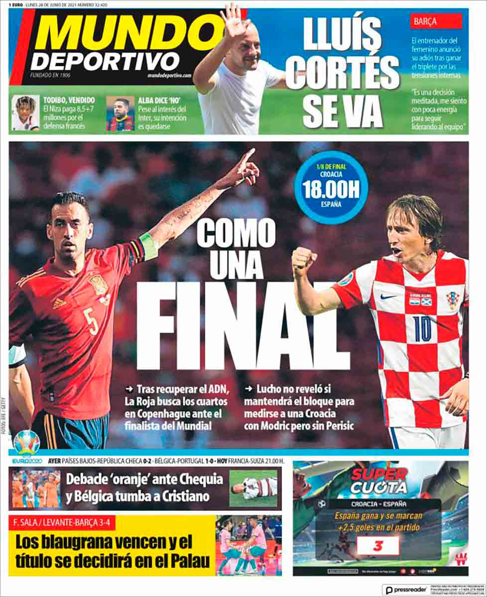 Saber que se puede, querer que se pueda. Nosotros, es decir, La Galerna, podemos rubricar sin temor a la duda la canción de Diego Torres (cuidado: no confundir con el periodista de El País que se inventaba las informaciones sobre el Madrid). Sabemos que se puede (¿cómo no va a poder España derrotar a una Croacia que, por ejemplo, no podrá contar con Perisic, contagiado de Covid?) y queremos que se pueda (ya hemos explicado antes por qué). En definitiva, queremos que gane España a pesar de que aparentemente es del todo obligatorio querer que gane España. "Querer que se pueda", parecen decir las portadas tan coercitivas, como dando una orden. Ya lo dijo el propio Luisen: "El que es español va con España". Sórdenes.