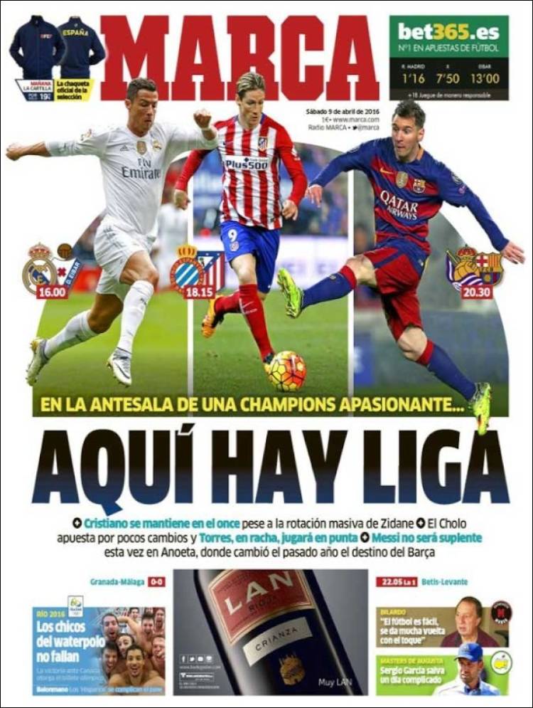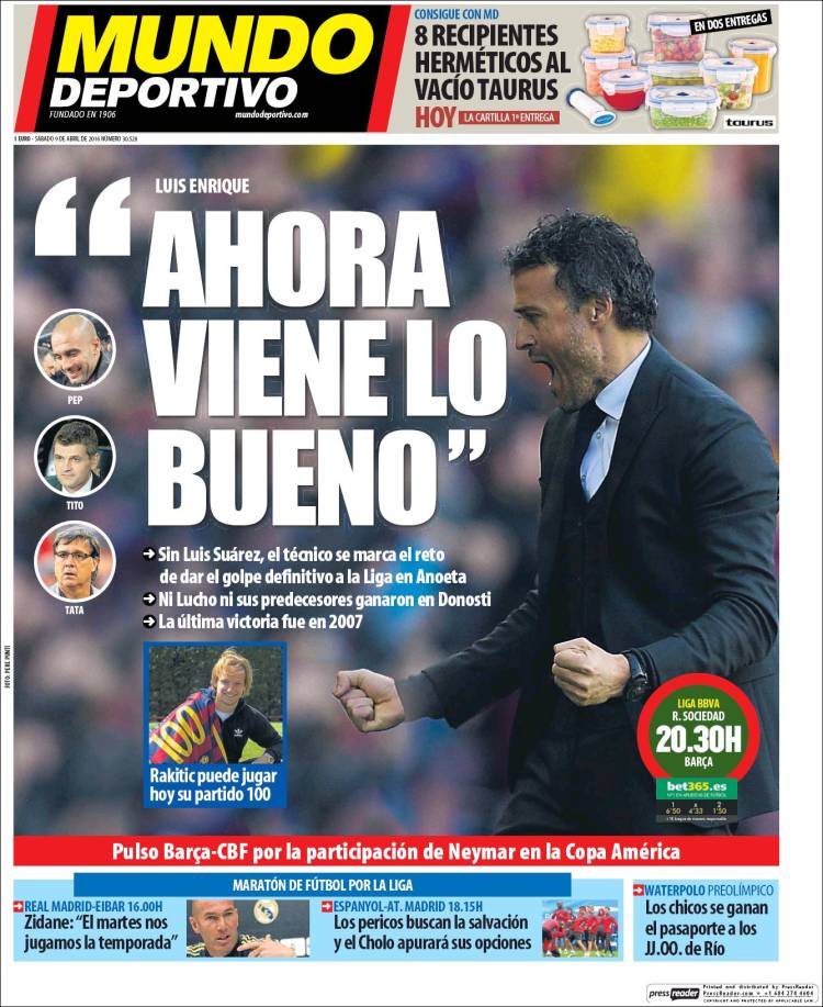 Coincidimos con las palabras de Luis Enrique que recoge la portada de Mundo Deportivo: "Ahora viene lo bueno". Ocurre, claro, que esperamos que lo bueno le venga al Madrid y no al Barcelona, pero entendemos que el entrenador culé quiere decir que estamos ante las horas decisivas de la temporada, esas que separan sin matices el éxito del fracaso, esas que conducen a ganar títulos y el derecho a la continuidad de un proyecto deportivo, o a perderlos y que las voces se alcen exigiendo la enésima creación del mundo (sobre todo si ese mundo es blanco). En esta sección sabemos que hay cierta falacia en estos absolutos, pero mientras reflexionamos sobre ello, ahora nos queda no perder ni un mínimo de atención en estas horas decisivas, ya casi minutos.