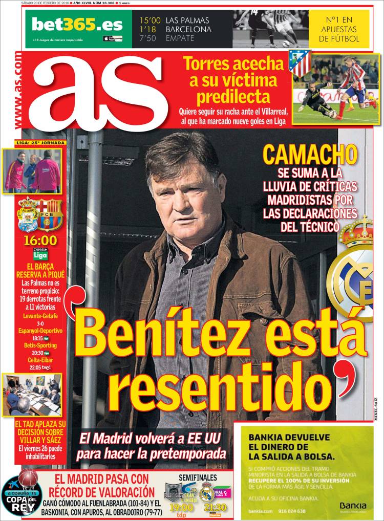 Pero cuidado, porque en doble tirabuzón aquí llega As para complicarnos más el asunto y dejarnos aún más aturdidas las entendederas. Su portada es para Camacho, quien parece atribuir al resentimiento las recientes declaraciones de Benítez en Inglaterra sobre el Real Madrid y su presidente (contestadas aquí por nuestro colaborador Ramón Álvarez de Mon).