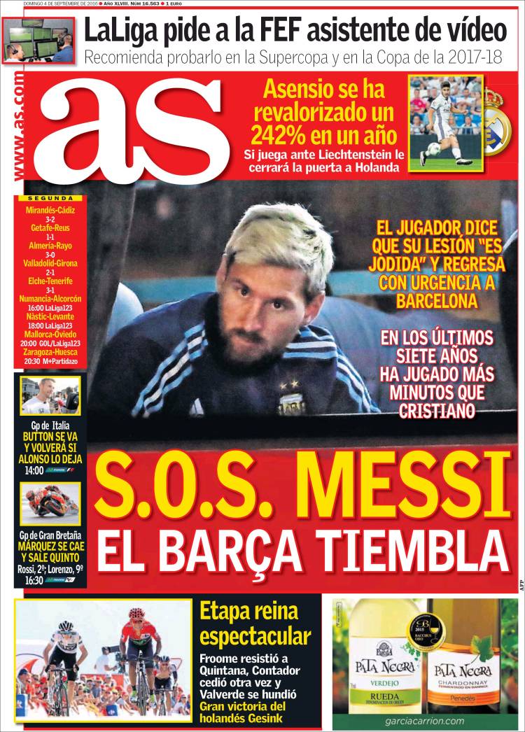 Disculpen el pequeño exabrupto del paréntesis anterior, pero es que la portada de As nos ha hecho así. Ya decimos que la cosa viene desenfadada y, díscolos como somos, nos sumamos fácilmente al desenfado. Si no nos creen, lean las doctas declaraciones de Messi que recoge Relaño en su portada en alusión a la "jodida" lesión del argentino. No sabemos si es grave, si requerirá de intervención o de un prolongado reposo, pero sabemos lo más importante, que es una lesión "jodida".