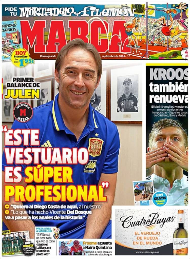 Sin embargo, lo más relevante de la portada es su asunto central, o mejor dicho, el modo en que es tratado este asunto. Solo una segunda mirada a la portada, acompañada de un análisis más o menos adulto, nos hace ver que estamos ante una entrevista al nuevo seleccionador que pretende ser cosa seria y rigurosa. Pero es que, si ya decíamos que somos díscolos en esta sección, ¿cómo se le ocurre a Marca ponernos arriba y bien centrado a Mortadelo y Filemón, más abajo una sonrisa de Lopetegui digna del tebeo y, por si fuera poco, la palabra "súper" bien grande y destacada en amarillo? Solo falta el profesor Bacterio para la cuadratura del círculo. Estos tres elemenos en perfecta conjunción parecen idea del mismo Ibáñez y no ya de Marca, aunque es justo reconocer que a veces tanto monta, monta tanto nuestra prensa deportiva como nuestro humor de tebeo.