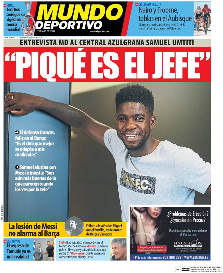 Ya ven que todo viene hoy alegre y vivaracho, y al guateque se une por primera vez Samuel Umtiti, reciente fichaje del Barcelona salido del mismo centro de la Masía (compartía habitación desde niño con André Gomes). Umtiti está encantado en la portada de Mundo Deportivo, sonríe ampliamente y apoya su brazo derecho en actitud explícitamente relajada. Los domingos tienen estas cosas, y más si no hay Liga porque hay un partido contra Liechtenstein (con dos cojones).