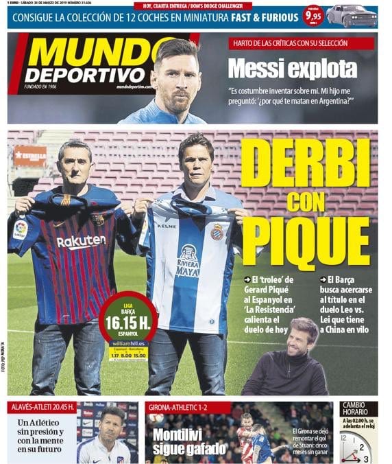 En 'Mundo Deportivo', pese a que también se compadecen de Messi, le dan prioridad al derbi catalán y ese pique mal entendido, ya que no puede ser pique si nadie del Espanyol se presta a ello. Más bien ha sido un ataque frontal de Piqué escudándose en el manido sentido del humor. Llegó a 'La Resistencia', hizo cuatro chistes para recibir el aplauso fácil y ahora que sean otros los que se coman el marrón de un derbi demasiado caliente.