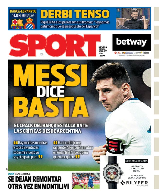 "Messi dice basta", lanza 'Sport'. Curiosamente, el argentino dice de todo menos "basta", aunque lo cierto es que ese titular añade dramatismo a la escena. Al parecer, en su país no entienden que Leo siga sin ser decisivo con la albiceleste, que naufrague sea quien sea el seleccionador, el dibujo táctico y/o los compañeros. Y eso molesta a Messi, que no se siente intocable. Nada que no pueda solucionarse con una nueva renuncia para siempre que finalmente será para un rato.