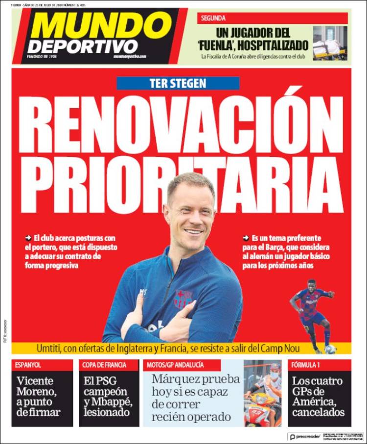 Las malas lenguas sostienen que, más de noventa y nueve partidos y menos de cien, viendo siendo sostenidos por el portero alemán y por D10s Messi casi desde que el Tata Martino era monaguillo, pero eso no pueden ser más que habladurías de resentidos. El falaz dato no casa con la simpar producción de cracks mundiales que La Masía ofrece al mundo para delirio de propios y risa floja de extraños. De ahí que Sport vaya al meollo de la cuestión y ofrezca una lista de los nombres del futuro, todos ellos desde ya candidatos al FIFA World Player, al Pichichi y al Nobel de la Paz. "Plan Renove" llama a esto Sport, no vaya a ser que esté reconociendo por vía negativa que la actual plantilla del Barcelona se ha quedado corta, excesivamente veterana y no tan cualificada como inicialmente pregonaban ufanos los mismos voceros. Para muestra, el faldón inferior de Mundo Deportivo, donde Umtiti, hace apenas diez minutos el nuevo Beckenbauer, parece negarse a dejar el Barcelona.