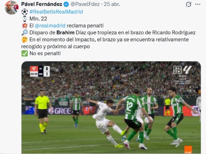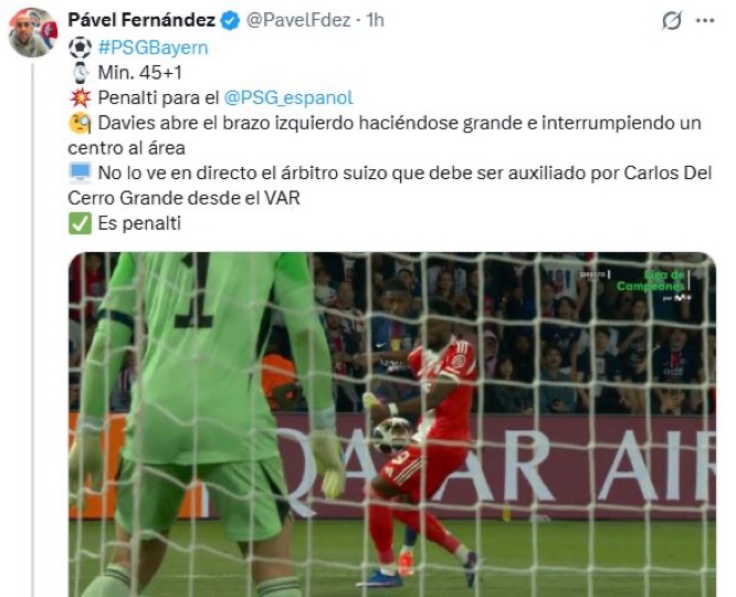 En el memorable partido de anoche, se produjo una jugada que da para un análisis del trabajo de los analistas, valga la redundancia. Fue un penalti por mano de Davies, en área bávara, que fue señalado como tal por el colegiado del VAR. La jugada es idéntica (o incluso menos clara) a la mano de Rodríguez del pasado viernes, en La Cartuja, a disparo de Brahim, pero en la piel de toro las jugadas se estiman de otra manera cuando hay por medio camisetas blancas. Curiosamente, y para subrayar aún más las diferencias ambientales, el mencionado árbitro de VAR era español, Del Cerro Grande. Los colegiados son un desastre en el contexto de la MLN, porque son fieles al putrefacto sistema. Cuando salen fuera (que es pocas veces, porque “fuera”’sabe de sobra lo corruptos que son) no desentonan en el aspecto técnico. No es él quién, es el dónde.