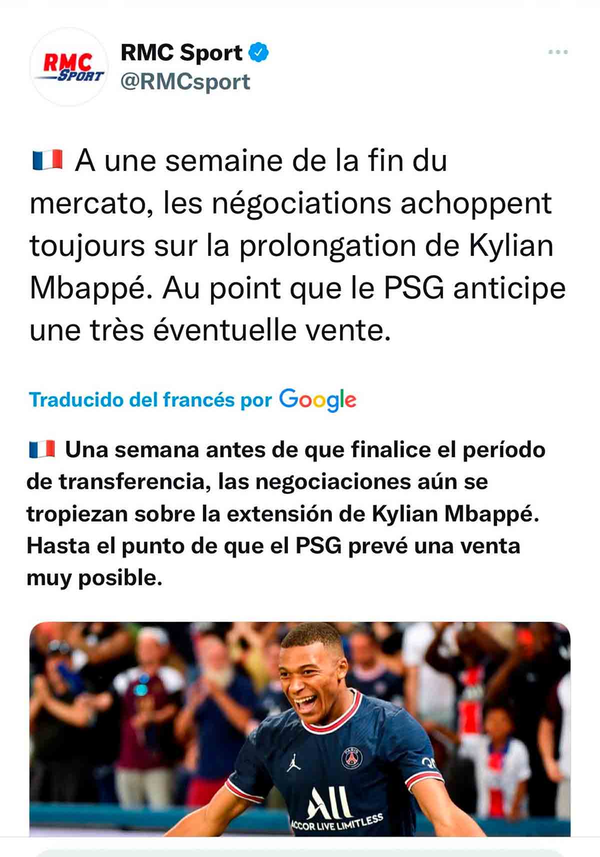 RMC, además de faltarle solo una efe para ser Real Madrid C. F., es uno de los medios más fiables de Francia, maneja buena información y suele acertar. Según cuentan, Mbappé habría rechazado la enésima oferta de renovación del PSG, un contrato de cinco años más uno. Y esta nueva negativa habría llevado al PSG a plantearse al fin su venta.
