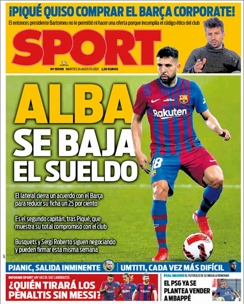 Llega la hora de la prensa cataculé, que también vienen con portadas iguales dos a dos, como los dónuts. Mientras que en el Madrid estamos pendientes de que el jeque quiera vender a Mbappé, sin (prácticamente) dar importancia al precio, en Can Barca la noticia más importante es que Alba se baja el sueldo un 25 %. Está claro que Madrid y Barça viven momentos diferentes.