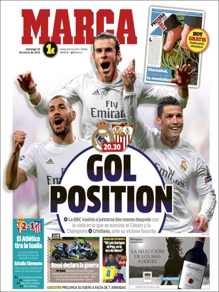 Dice As que Benzema tendrá minutos, que volverá James al once, que Cristiano puede seguir buscando la Bota de Oro y que el Madrid va a por el segundo puesto del Atleti tras su derrota de ayer en Gijón. Todo eso es cierto, y nosotros nos permitimos añadir la necesidad de mostrar el brío suficiente como para que el equipo no se deshilache ahora que van llegando los momentos cruciales de una temporada que no es que se pueda salvar, sino que puede acabar en gloria si se completara con la (improbable ma non troppo) consecución de la Undécima. ¿Qué mayor aliciente que ese puede haber? A nuestros ojos, todo lo demás son solo estímulos si están enfocados, si se ponen al servicio, de este logro final, para lo cual bien haremos en ganar hoy con alegría al Sevilla, la misma alegría que suele brillar por su ausencia cada vez que As se encuentra con el engorro de tener que hablar del Real Madrid.