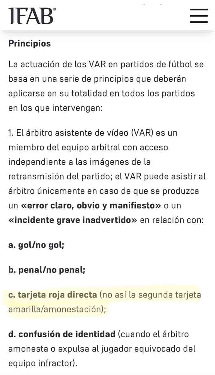 Pulido Santana, a la vista literalmente de todo el mundo, cometió una ilegalidad. Entre los supuestos previstos por la normativa para que actúe el VAR se encuentra la tarjeta roja directa, pero no la segunda amarilla.