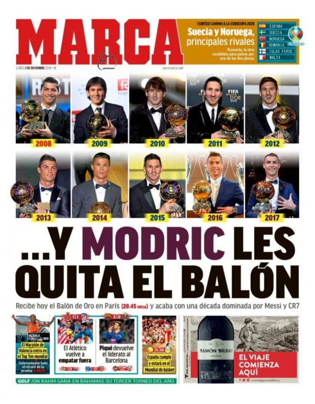 Me quedo con la portada de Marca y con nuestro Modric que desbancará a Cristiano y Messi...perdería mucho brillo el balón de oro si se lo llevara un ganador de la Europa League....