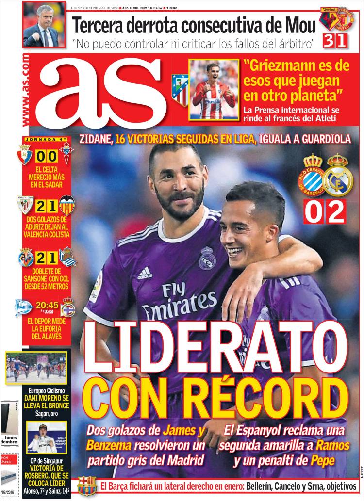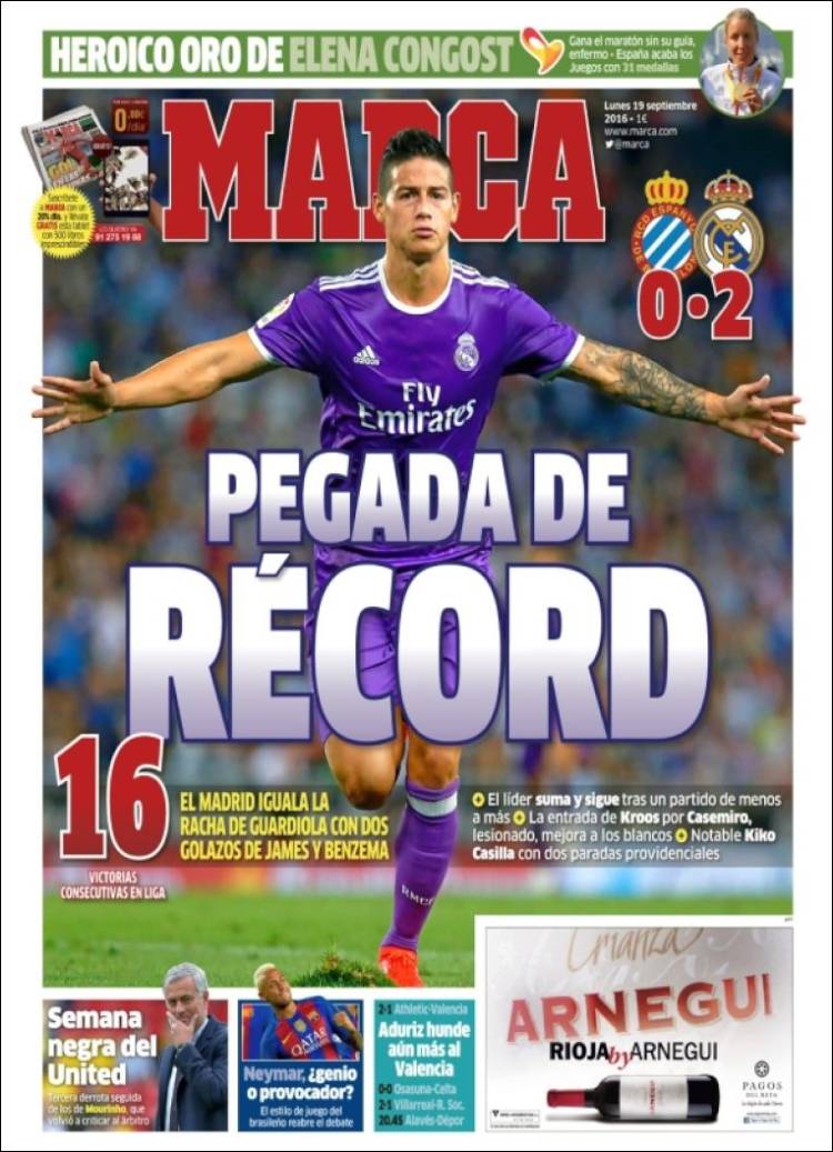 "El Espanyol no puede con el Madrid... ni con el árbitro". Qué sutiles, qué literarios esos puntos suspensivos. Los puntos que logra en Madrid en Liga, como estos de Sport, siempre son suspensivos, en el sentido de que nunca le dan para aprobar. A quien nosotros sí aprobamos, desde luego, es al gran James que hoy trae a portada Marca. Nos gustó más, como jugada colectiva, el gol de Benzema, pero cuantísima destreza, qué maniobra de estrella del fútbol mundial la del colombiano en su tanto. Puede que esté de vuelta, y no habría mejor noticia.