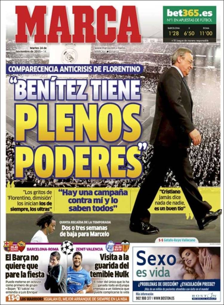 Marca opta por un reflejo mucho más aséptico de la comparecencia de Florentino Pérez, la cual a nosotros, la verdad, nos pareció bastante bien. Pero no se lo digáis a nuestras madres: ellas están tan tranquilas pensando que odiamos a Florentino y sometemos sus fotos a orgiásticas sesiones de vudú con gallos despedezados y fetos malogrados de marsupio.