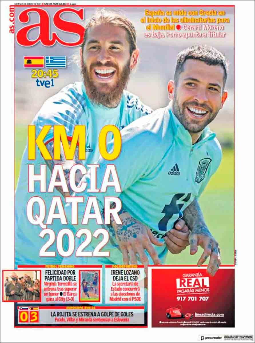 As aprovecha estos tiempos de zozobra futbolística provocada por el parón de selecciones para jugar al equívoco con su portada. La fotografía que la ilustra muestra a Sergio Ramos y a Jordi Alba jugando al trenecito y titulan “Km 0 (suponemos que porque no hay distancia entre ambos, ¿o el cero es otra cosa?) hacia Qatar 2022”. De nuevo nos surgen dudas: ¿qué sugieren que van a catar en semejante postura? ¿2022 es una fecha o el número de veces que lo van a catar? En fin, no sigamos por ese camino.