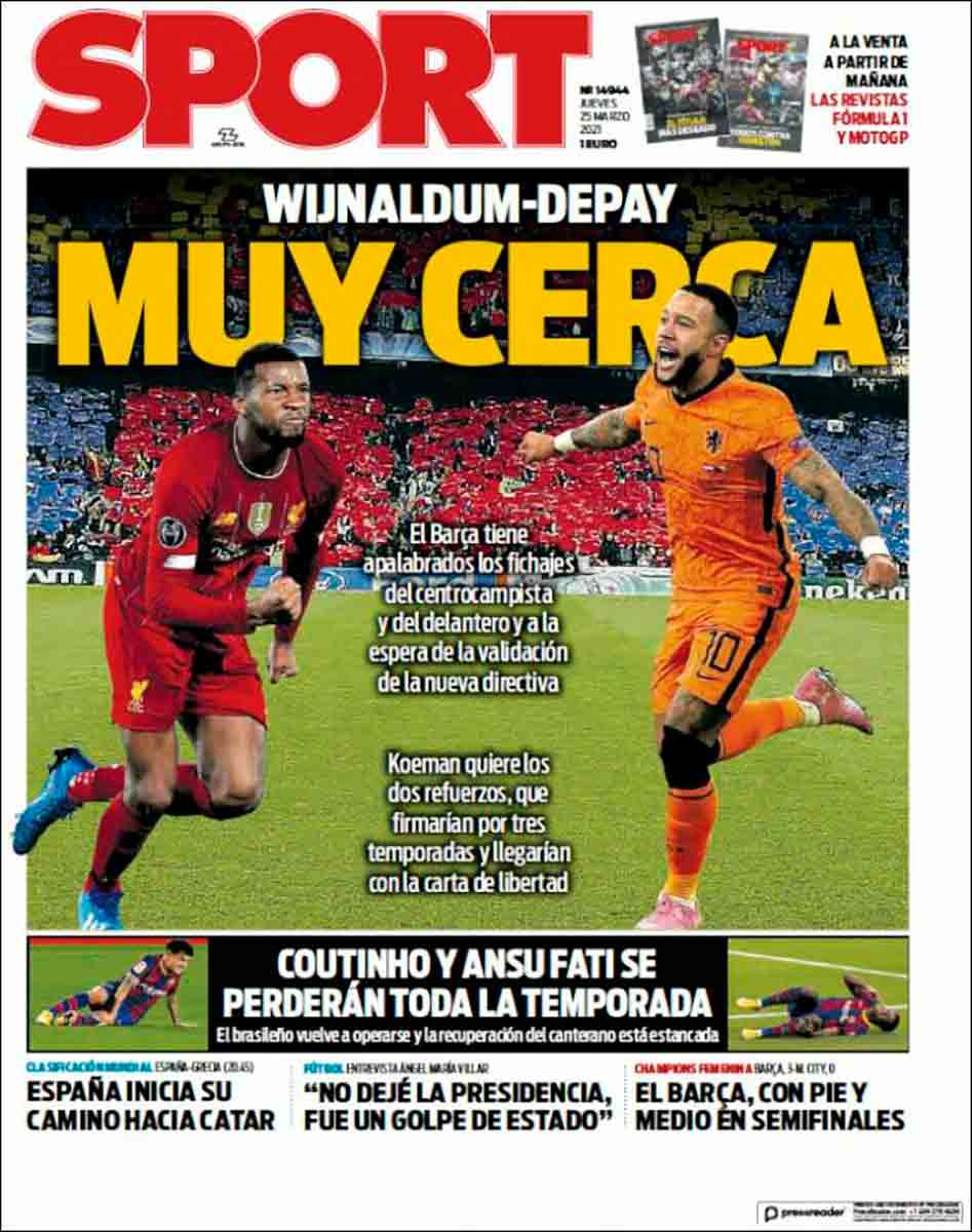 Sport abre con una obviedad visual: publican una fotografía de Wijnaldum y Depay juntos y titulan. “Wijnaldum-Depay muy cerca”. ¡Ya vemos que están muy cerca! Pero como todo lo que proviene de can Barça es falso porque la imagen es un montaje. Después, al leer las letras más pequeñas, parece ser que se refieren a que están cerca de fichar por el Barça. En fin, ya somos mayores para estas cosas, nos esperan meses leyendo lo mismo, como con Lautaro el año pasado.
