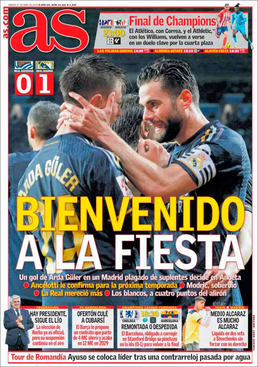 En As aparece el capitán Nacho felicitando a Arda y titula «Bienvenido a la fiesta». Ancelotti se encargó en rueda de prensa posterior de confirmar a Güler para la próxima temporada.