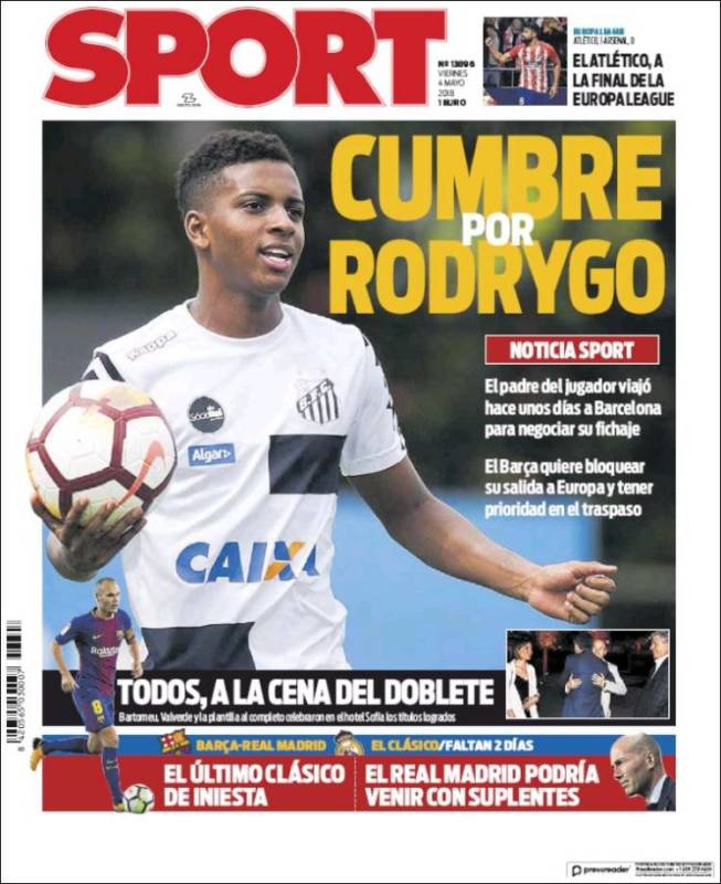 Juzgad vosotros mismos. Si ellos han sabido que hay una cumbre (¡cumbre!) por Rodrygo (no es una errata), ¿cómo no van a otorgarle la portada a semejante primición, pasando por encima incluso de la cena del doblete del Barça, pasando incluso por encima (sí, aunque duela) del alcance universal de la Europa League, sobre la que aún no recordamos qué dijo Gabi?