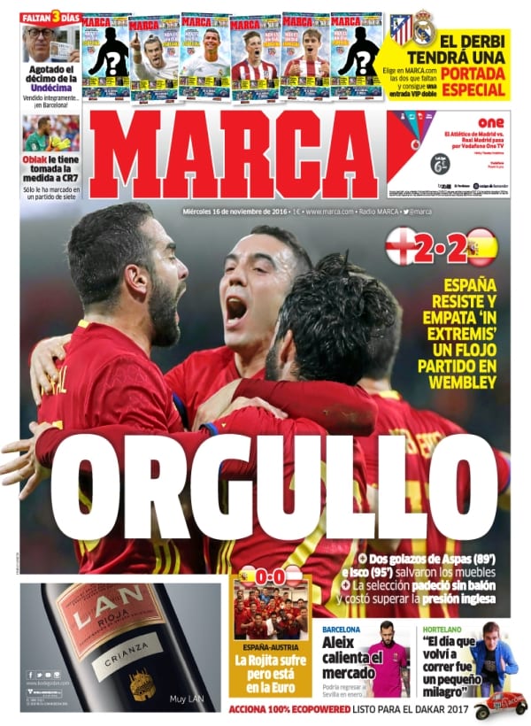 En Madrid, mientras tanto, un poco de azúcar al mal partido de España en Wembley. Se empató sobre la bocina y es lo que importa. El resultado es el que manda, no como cuando juega el Real Madrid, que si gana jugando mal no vale, si empata jugando bien es un desastre y si pierde jugando bien o mal tiene ya el paredón preparado para que el pelotón de fusilamiento se despache a gusto. España no jugó a nada, pero, oye, tampoco perdió. Lo de usar la misma vara de medir para todos, quizá mejor la próxima temporada. O la siguiente. O a la otra...
