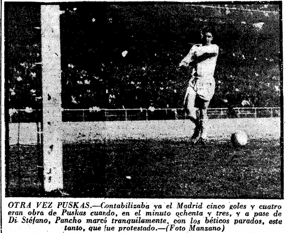 El segundo a los 26’: “Gento pasa sobre Casado adelantado. El defensa corre en misión de extremo izquierdo y centra muy bien. Puskas, de cabeza, marca por el lado izquierdo de la meta bética”. El tercero a los 66’: “Grau pasa mal y la pelota se la lleva Del Sol, que la envía sobre Puskas y este, de un gran tiro cruzado a la izquierda, logra un nuevo tanto”.