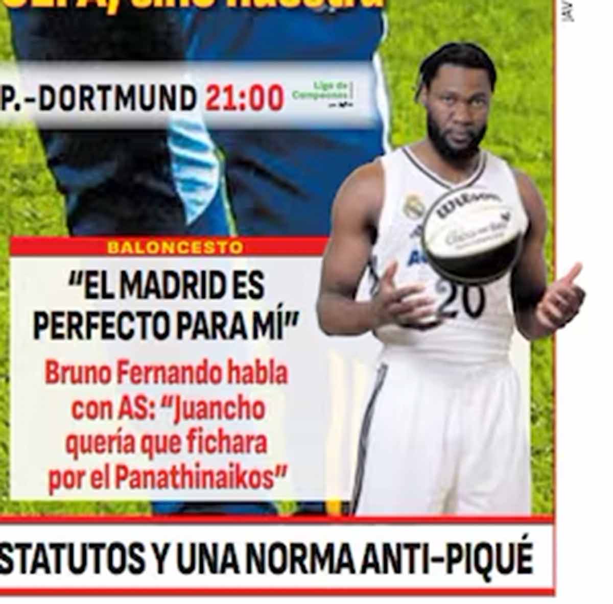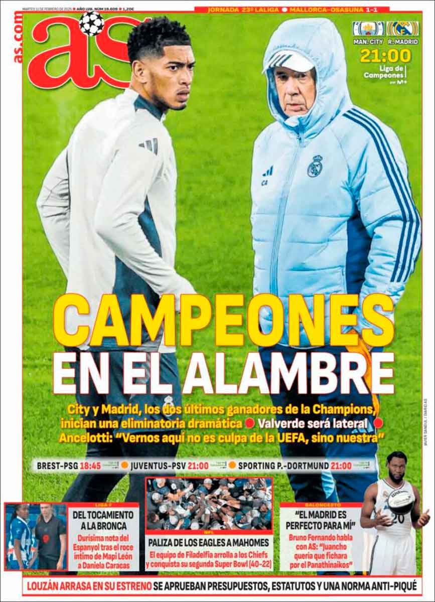 El otro diario deportivo de Madrid, As, titula «Campeones en el alambre» sobre una imagen de Bellingham mirando a uno que sorbe al comer sopa y de Ancelotti vestido como Kenny McCormick.