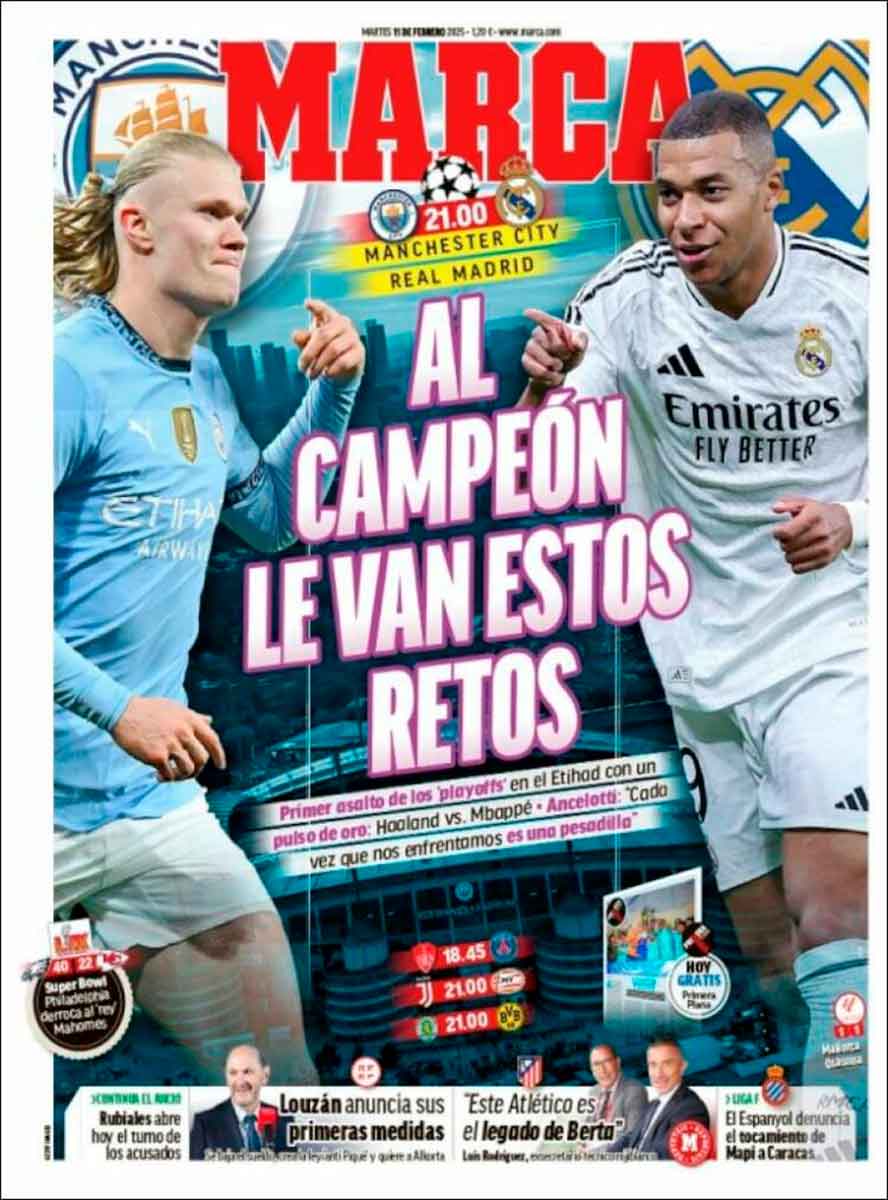 «Al campeón le van estos retos». Efectivamente, Marca. El rotativo de la capital destaca este «Primer asalto de los ‘playoffs’ en el Ethihad con un pulso de oro: Haaland vs. Mbappé». Todos hemos visto ya el suficiente fútbol para saber que cuando la atención está centrada en Erling y Kylian, al final el partido lo decide Bernardo o Brahim (o cualquier otro).
