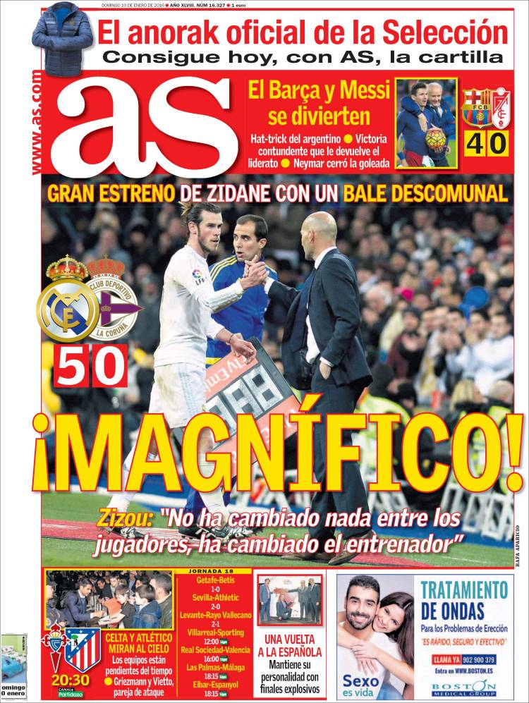 Pero es que hay más, mucho más, doctor. También Relaño nos regala la vista y el oído esta mañana, y eso ya nos parece cosa digna de Iker Jiménez. No nos diga que demos un paseo por el campo o que respiremos hondo, que nos entran los siete males. Esto no es posible. Le damos la vuelta a la portada de As una y otra vez y la seguimos viendo impoluta, con un titular sin riesgo de malcomprensión, una foto con los protagonistas del partido de ayer y un adjetivo -"descomunal"- que, tras no pocos cafés, sigue estando ahí dedicado a Gareth Bale. El niño también lo ha leído y certifica la presencia del adjetivo, y también la abuela con las gafas nuevas que le han traído los Reyes.